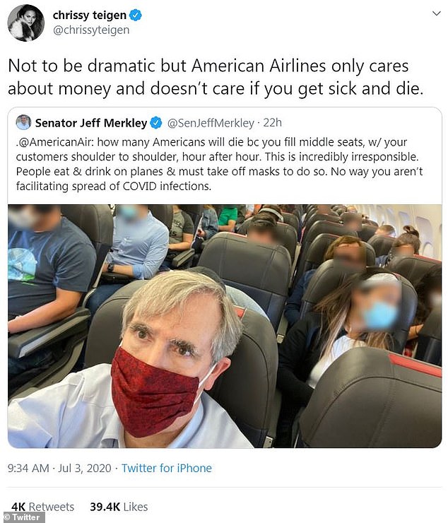 Chrissy Teigen publicly lambasted American Airlines on Friday, after Senator Jeff Merkley (D-Ore.) uploaded a photo of his packed flight to Twitter.